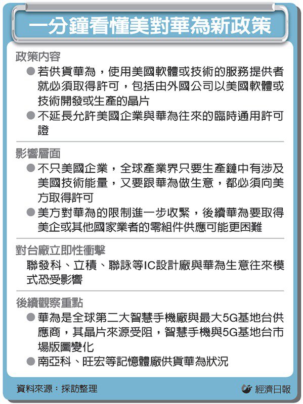 美国对华为祭出新禁令,市场担忧联发科、联咏、立积等华为芯片供应商出货受挫,IC设计族群成为昨(18)日成为台股重灾区。外媒点名,“华为新禁令,遭殃的不仅是联发科”,存储器厂恐是下一波受影响的业者。 三星、SK海力士等国际大厂,以及南亚科、旺宏、华邦等台湾存储器厂,均供货华为。台湾存储器厂均强调,出货华为营收比重不大,将依循国际法规,满足客户需求,对于美政府新规定,将与法务单位研究,绝对仍会遵守国际规范。 法人指出,存储器市场本季原本就面临供过于求的压力,业者普遍保守看后市,华为是全球第二大智能手机厂暨5G基地台龙头,单是手机年出货量就高达2亿支,使用的存储器用量堪称全球品跑厂数一数二,若存储器厂碍于美国新制成无法供货,势必面临更大的削价清库存压力,恐让存储器短期市况雪上加霜。 法人分析,短期内以旺宏受华为新禁令影响可能相对明显。旺宏董事长吴敏求曾表示,为因应5G世代新需求,旺宏编码型快闪存储器(NOR Flash)低功耗、高速传输(IO)及高容量的存储器解决方案受到客户采用,目前已得约八成5G基地台厂商采用,当中包括华为这家网通客户大单。由于华为是全球5G基地台龙头,未来若华为出货受冲击,业界忧心将牵动旺宏出货。 南亚科总经理李培瑛先前曾表示,今年第1季对华为的出货比重仅约3%,对南亚科影响有限。华邦电高层则表示,禁令短期内对营运有影响,若原有客户需求减少,将争取其他供应商的市场机会,目前还处于衔接过程。 美国商务部新命令规定,所有供货给华为的芯片厂商,不论身在何地,都须经美国官方核准。商务部强调,只要使用美国设计的软件和设备,即便芯片不是华为设计所需,只要供货华为,外国公司也须取得美政府授权。此举将冲击相关芯片厂出货。 市场昨日焦点集中在联发科等IC设计股,但存储器厂生产过程中,无可避免采用美商的电子设计自动化(EDA)工具与设备材料,日经新闻引述专家看法,点名南亚科、三星电子、SK海力士等存储器厂,只要使用美国的软件和技术,未来也可能得受新规定的规范新规定的规范。 业者私下透露,目前华为事件对整体存储器冲击并不大,中长期来看,存储器是5G发展不可或缺的关键元件,随AI、智慧车、智慧工厂、物联网等快速发展,存储器需求会持续成长,供应大厂则有节制增加产能,整体景气很快就会向上翻扬。 外媒报导,美国这项禁令也可能波及高通、英特尔等美企,以及亚洲、欧洲一些较小的芯片制造商。
