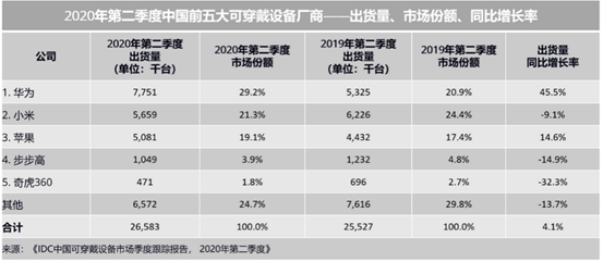 发表日期:2020-09-02 , IDC最新的《中国可穿戴设备市场季度跟踪报告,2020年第二季度》显示,今年二季度中国可穿戴设备市场出货量为2658万台,同比增长4.1%,基础可穿戴设备(不支持第三方应用的可穿戴设备)出货量为2224万台,同比增长6.1%。智能可穿戴设备出货量为435万台,同比下降4.9%。 华为凭借运动手表GT2和真无线耳机Freebuds 3,不仅在手表和蓝牙耳机市场上份额增长明显,更巩固了其在整体可穿戴设备市场上的榜首地位。